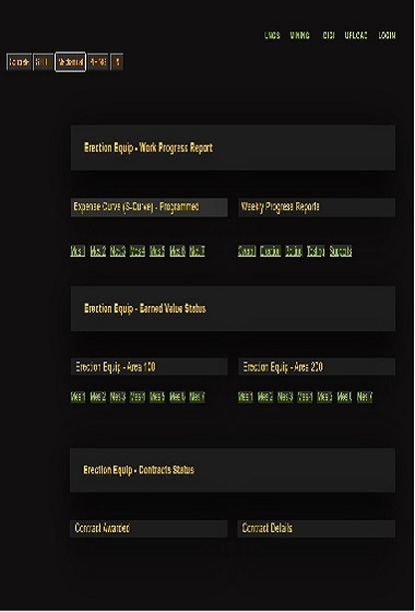 The buttons at the upper left side (colored in orange) let users to interact with construction disciplines; each discipline has been designed to show two main categories: 1) work progress reports; 2) contracts status reports