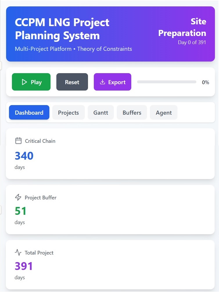 A comprehensive CCPM Planning System that in this exercise applies Theory of Constraints to an LNG Site Preparation project. It has as key features: 1) Constraint Identification, 2) Buffer Management, 3) Production-Rate Based Planning, 4) Real-Time Simulation, 5) TOC Integration.