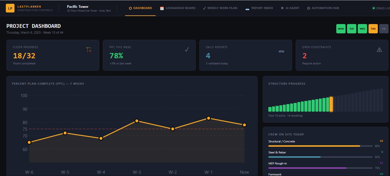 A construction project controls built around the Last Planner System (LPS) methodology, involving a Local Agent at Headquarters and a number of n8n workflow templates to produce different results.