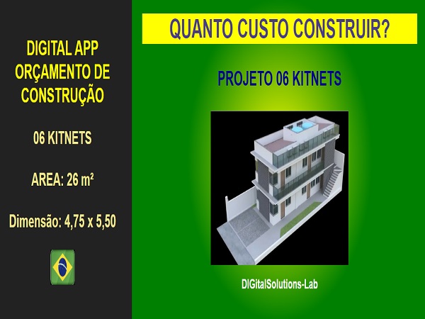 - Estimativa de orçamento para construção de 06 kitnets com area de 26,00m², em terreno no tamanho 160,00m² com dimensao de 8,00 metros de frente por 20,00 metros de fundo.