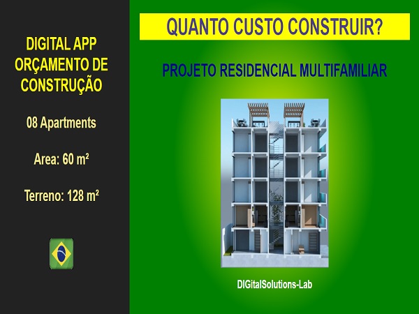 - Orçamento detalhado de construção de um prédio com 08 apartamentos com area de 60,00m²; divididos em 4 pavimentos, em terreno no tamanho 128,00m² com dimensao de 8,00 metros de frente por 16,00 metros de fundo.