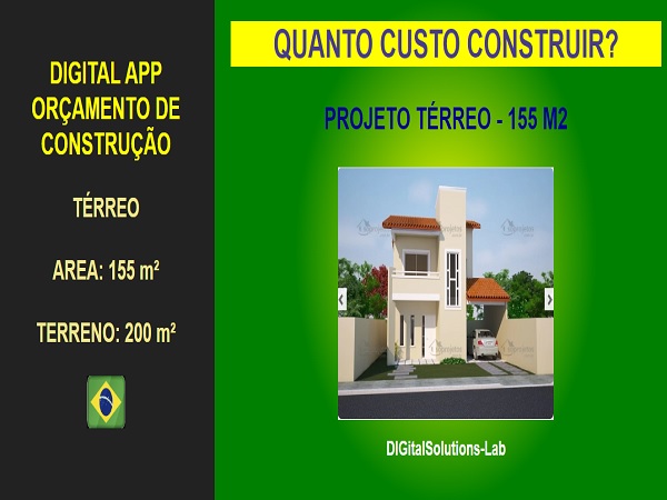- Estimativa de orçamento para construção de casa térrea com área de 155 m², em terreno de 200 m² com 10,00 metros de largura por 20,00 metros de fundo.
