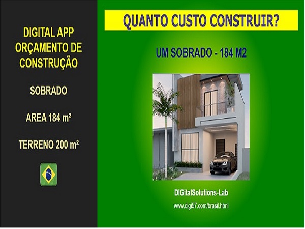 - Estimativa de orçamento para construção de uma casa de dois andares com área de 184 m², em terreno de 200 m² com 10,00 metros de largura por 20,00 metros de fundo.