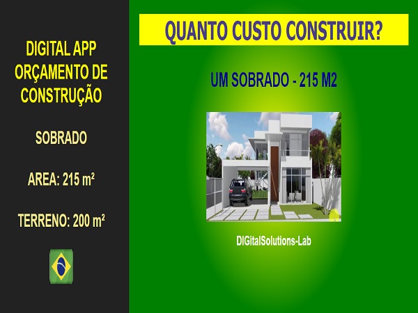 - Estimativa de orçamento para construção de uma casa de dois andares com área de 215 m², em terreno de 200 m² com 10,00 metros de largura por 20,00 metros de fundo.