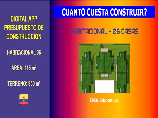 - Estimación de presupuesto de construcción de un conjunto habitacional compuesto por 06 casas, con un area promedio de 115 m², que se puede construir en un terreno de 950 m².