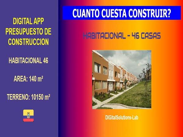 - Estimación de presupuesto de construcción de un conjunto habitacional compuesto por 46 casas, con un area promedio de 140 m², que se puede construir en un terreno de 10150 m².
