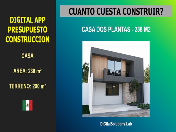- Estimación de presupuesto de construcción de una casa de dos plantas, con un area promedio de 238 m², que se puede construir en un terreno de 10m x 20m.