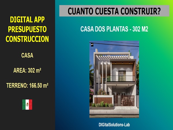 - Estimación de presupuesto de construcción de una casa de dos plantas, con un area promedio de 302 m², que se puede construir en un terreno de 9m x 18.5m.